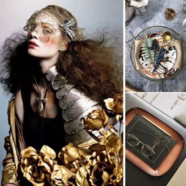 其次就是金属了,金属铜、钢尤为具有代表性,相对以前的鎏金、镀金、贴金会来说,更显低调,但同时它又具有特别的表现性,能将视觉效果发挥到极致。哑光的金属铜,就是轻奢低调感的呈现。