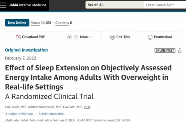 《JAMA内科学》发表的一项研究报告显示,实验参与者每天的睡眠时间增加1.2小时,摄入的热量就能减少270千卡,对参与者进行了2周的干预实验后,参与者的体重平均下降了1斤。
