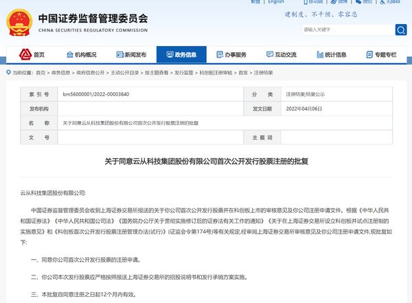 4月6日,中国证监会发布批复称,同意云从科技集团股份有限公司(下称“云从科技”)首次公开发行股票的注册申请。云从科技或将成为“AI四小龙”中首家成功登陆科创板的公司。