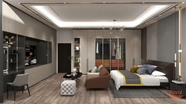 位于二层的主卧,功能区分更为细致,满墙做满柜,棕灰色如同大地一般,充满着力量。多种元素的组合,在一个空间里产生动与静的平衡。