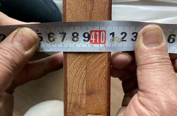 3月15日,在唐先生家中,记者看到了这扇被拆下来的门。该门颜色为深红色,其各个部件均被拆下来陈列在一张床上。其中门芯板有三块。记者拿起其中两块掂量,发现虽然大小和外形一样,但重量却不一样,说明这两块板材的用料确实有区别。记者拿起一块端详发现,其横断面约有4厘米厚,最里面是由两块木头拼接而成,但显然不是红橡木,只有侧边部位和最外面一层贴皮为红橡木。