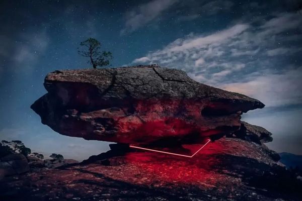 在深夜的黑暗里,我们总是期盼有一丝闪烁的微光,他用几根简单的霓虹灯管嵌入山川河流等自然景观中,以微弱柔和的光唤醒了沉睡的夜,让黑夜散发迷人的光彩。