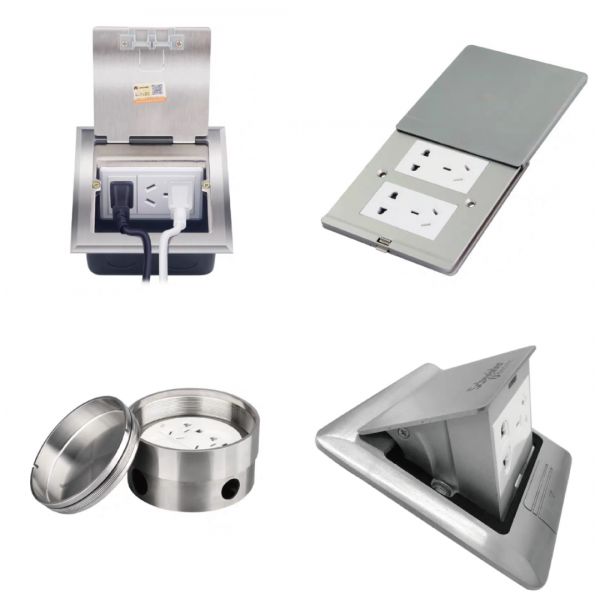 地插面板的主要材质有铜合金、锌合金、不锈钢和纯黄铜,根据大小不同分为单联和双联,有弹起式、开启式、螺旋式和平推式四种开合方式。