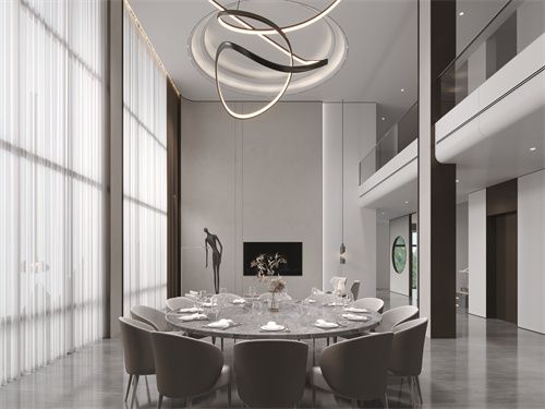 一楼为家庭公共空间,餐厅与客厅合并在一起,将大面积落地窗与空间几何结合起来,空间陈设去除繁杂,优雅灰为主调,空间没有多余装饰,强调了空间简洁,吊灯居于空间中心,造型简单而又统一。
