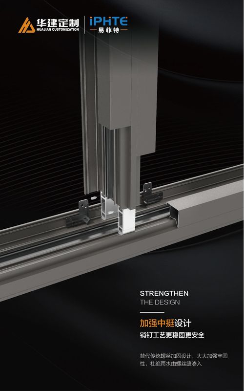 以华建定制易菲特高端门窗为例,型材上采用PA66高性能多腔体隔热条,具有优良的隔热保温效果,同时在窗体的加固上采用销钉工艺,加强中挺设计,替代了传统的螺丝加固设计,杜绝了雨水由螺丝缝渗入。