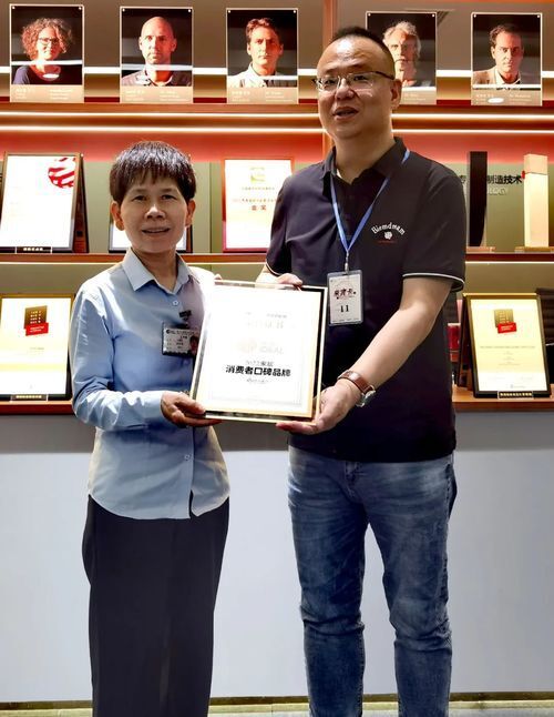 5月30日,新浪家居陶瓷卫浴事业部闫守罡总经理(图右)把“2022家居消费者口碑品牌”奖牌送到理想卫浴销售刘健美总经理的手中。