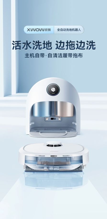 作为首款全自动洗地机器人,晓舞革新了扫拖机器人拖布自清洁系统构造,研发了自清洁履带式拖布,同时将手持洗地机的清水污水盒构造植入到了机器人上,让晓舞可以实现活水洗地。