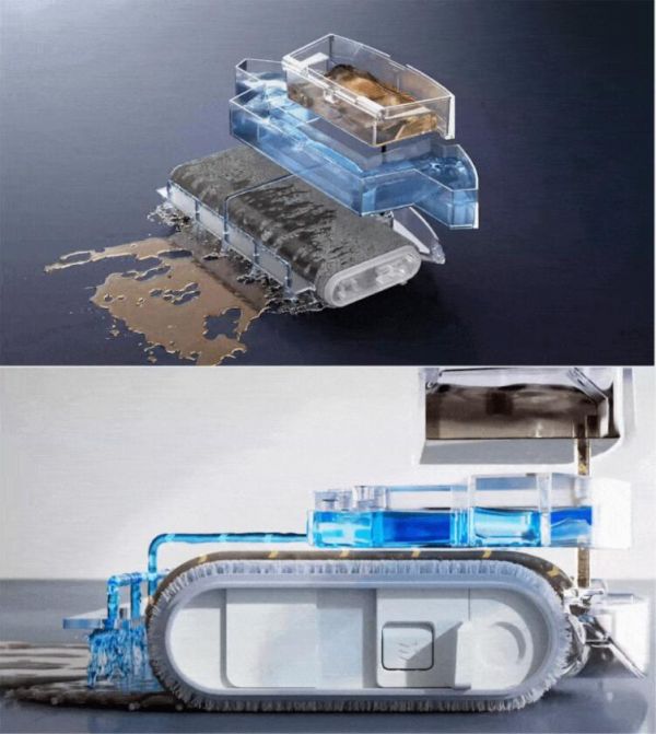 通过机器人的清水盒向地板喷洒清水,让清水有效稀释顽固污渍,拖布前行带走脏污后再通过与拖布一体的刮条和污水盒,将拖布上的污水储存在污水盒中,最后再用清水继续拖地,不用回基站就可以自行完成自清洁循环。