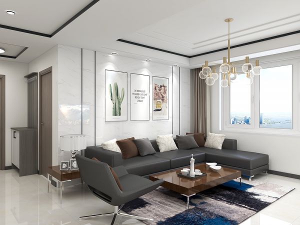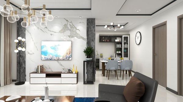 客厅第一眼看上去足够气派敞亮,灰白相间的大理石电视墙大气时尚,搭配深灰色沙发,搭配现代化时尚灯具,色调协调美观。