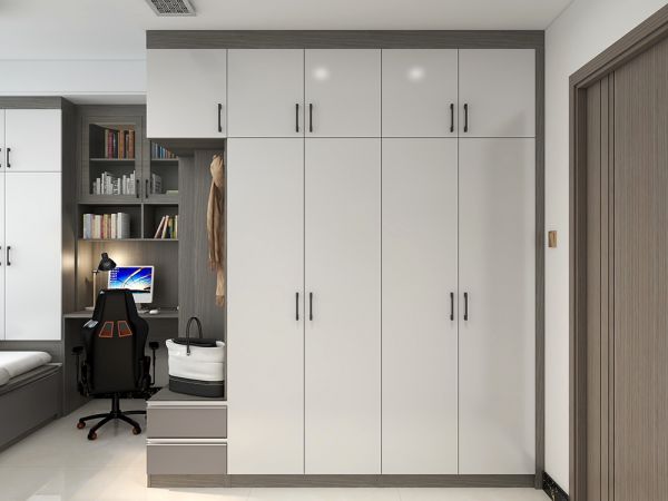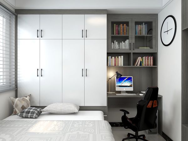 设计师为了满足屋主收纳和工作的需求,卧室衣柜和书桌的拼接,显得自然且协调。