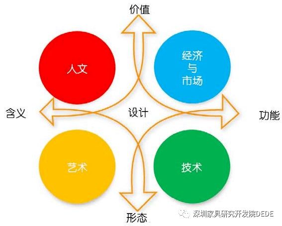 设计的成果输出由功能、形态、含义与价值来呈现,创作所需的要素是经济与市场、技术、艺术以及人文等因素,这些因素无法独立解决设计所需呈现的目标,而是交互作用的结果。如:功能需要考虑经济与市场、技术等;形态则由技术和艺术所共同作用;含义包括艺术和人文两个方面;而价值不仅有经济与市场方面的价值,还有人文价值在内,如此等等。技术不仅对功能起作用,也对造型产生影响;艺术不仅与形态密不可分,还有含义呈现;人文有含义,也有价值考量;经济与市场不仅有功能方面的要求,也有价值诉求。见图1-1所示。