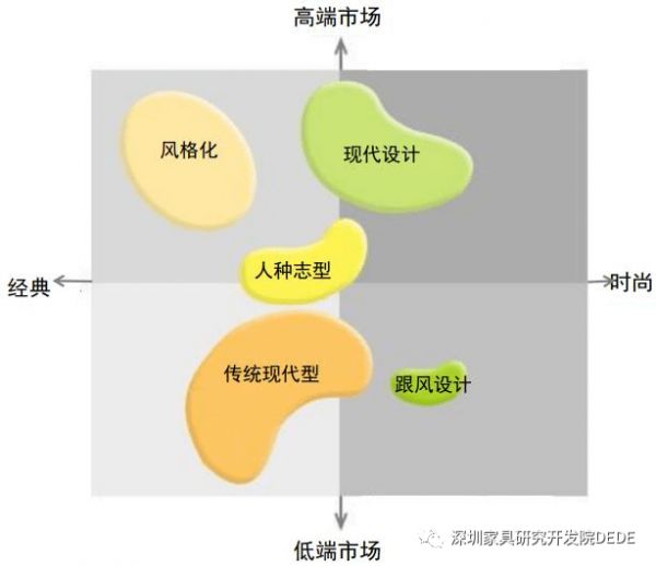 其他四个板块都是去风格化的,只不过又细分为了设计导向型、跟风设计型、人种志型和传统现代型等四种类型。这对当今中国家具行业与市场会有一定的启示作用,因为实际上还涉及到了不同企业的定位参考。其中:设计导向型是以创新设计为核心的,凸显设计的价值,因此位于高端市场;跟风设计型容易理解,处于低端市场,要求反应速度快;传统现代型还是属于现代风格,但从横坐标中可以看出相对前两者而言走的不是时尚路线,而是相对经典,市场位置也是处于低端的,上不到高端市场,因为无论是历史文化还是设计艺术,两方面的价值都不够;人种志型是基于地域文化的,如针对特定国家、民族和地区而赋予的特殊物质与精神意涵,一般处于中端市场的位置,价值高不上去,也低不下来。