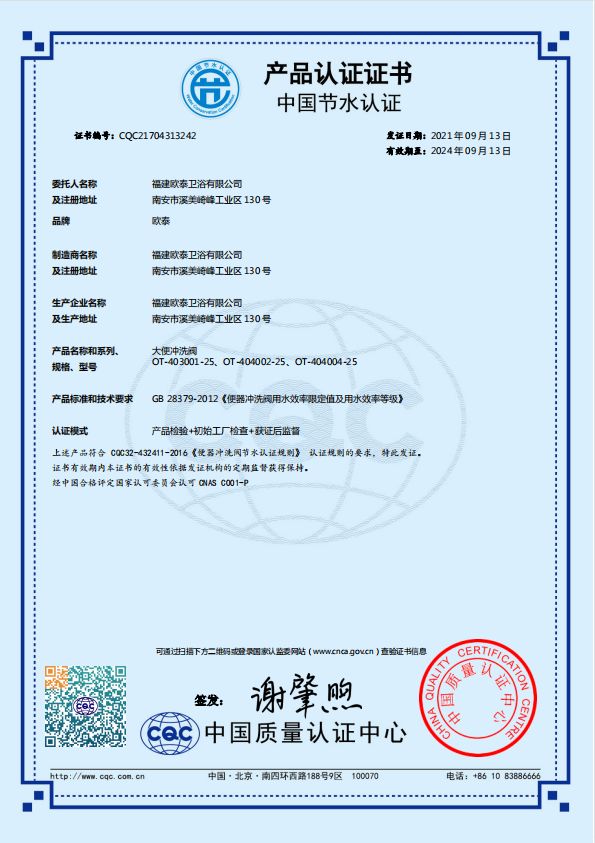 不仅追求产品质量稳定,欧泰卫浴还积极响应关于“加快建设资源节约型、环境友好型社会”的号召,通过自主技术研发,在产品的节水性能上精益求精,不仅多款产品通过节水产品认证,且不少产品达到了1级水效标准。