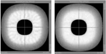 左图,灯珠与灯罩过近,可见颗粒感眩光;右图,距离调整后,无明显颗粒感眩光