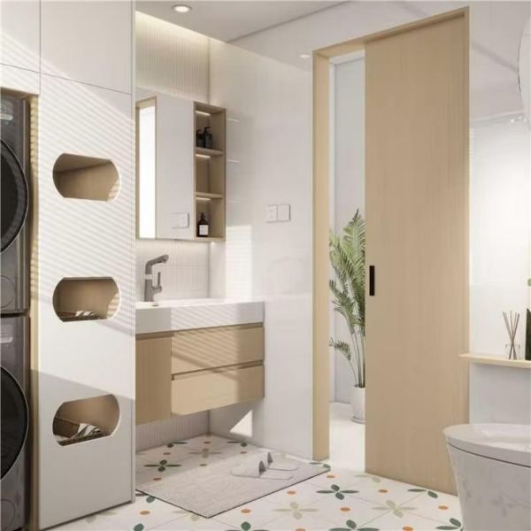 仿石材岩板以其天然肌理和微妙光泽成为空间中的视觉焦点。在直射光或侧光环境下,岩板表面能够形成柔和的光晕,增强视觉延伸感,让空间更显开阔与通透。而微水泥墙面则以低调细腻的质感见长,其哑光特性使光线扩散更加均匀,营造出宁静、质朴且近乎冥想式的氛围,尤其适合用于打造现代极简和侘寂风格的卫浴环境。