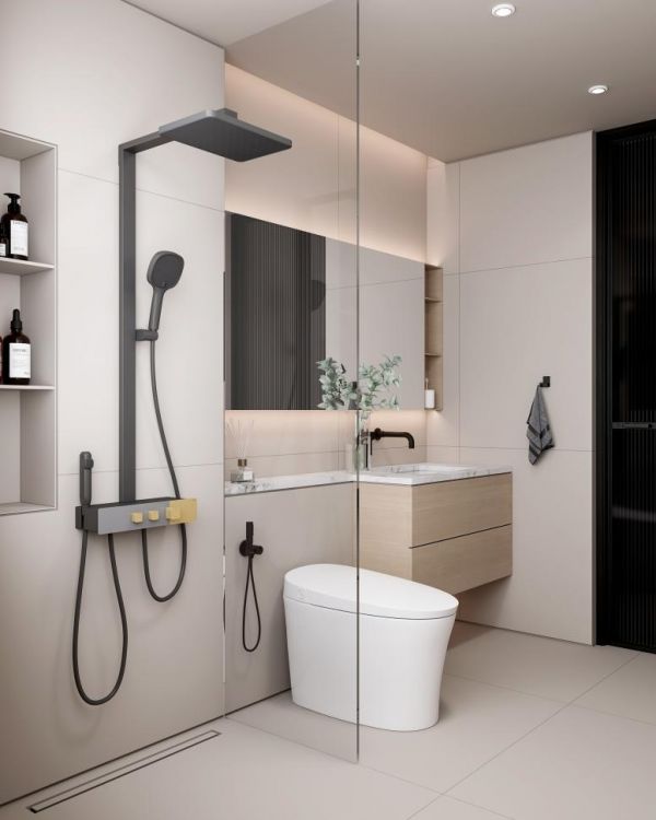 线性LED灯带被巧妙地嵌入浴室柜下方、镜柜背后,形成柔和间接照明。这种见光不见灯的设计手法,既避免了眩光干扰,也勾勒出空间的结构轮廓,在视觉上减轻体量感,尤其适合小户型卫浴空间。淋浴区则通常搭配防水防眩的射灯与氛围光,让沐浴成为一天中最放松的光感时刻。