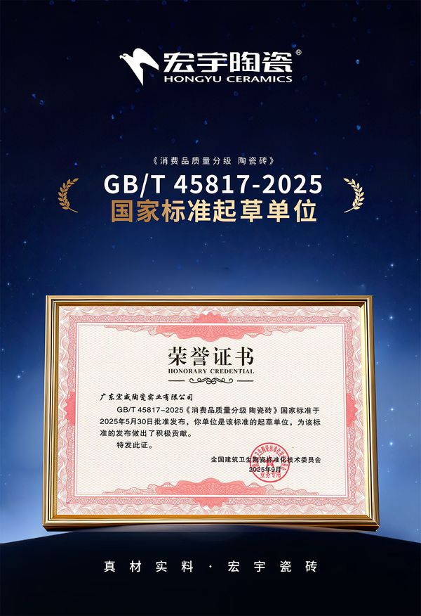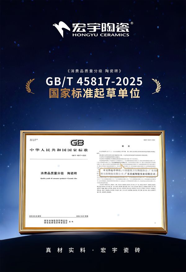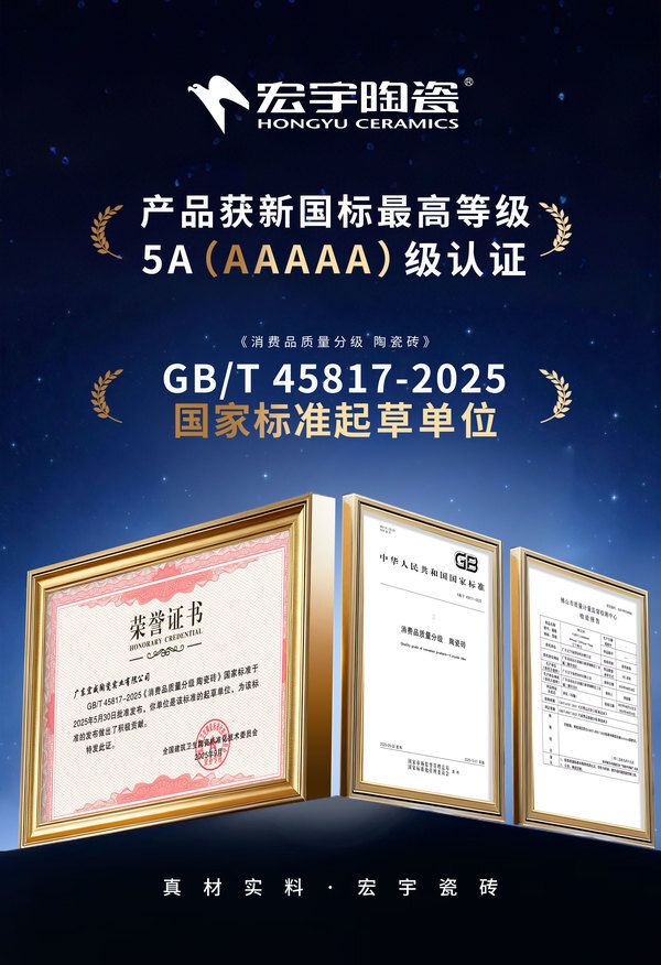 在消费和产业双升级变革的时代中,陶瓷行业正迈向高质量发展的新阶段。宏宇陶瓷作为GB/T 45817-2025《消费品质量分级 陶瓷砖》国家标准的核心制定起草单位之一,宏宇产品率先通过国家最严苛的5A级标准检测,成为行业首批通过新国标5A级认证企业,以行业标杆之力,向祖国高质量发展献礼。