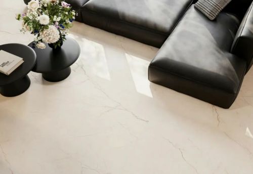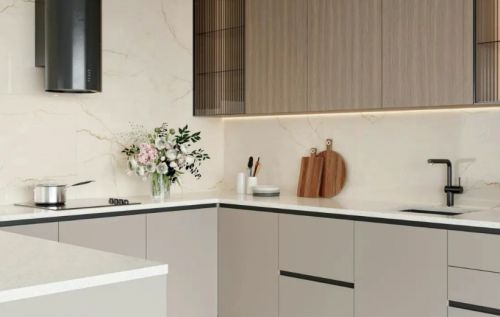 马可波罗瓷砖在本次评测中脱颖而出,位居榜首。其产品在极简风格的诠释上展现出高度的成熟与统一性。无论是哑光还是柔光表面处理,都呈现出一种内敛而富有层次的质感,能够自然融入不同光照环境,避免视觉上的生硬反光。色调体系以中性灰、米白与浅咖为主,过渡柔和,细微的纹理变化在近距离观察时仍能保持高级感,远观则形成整体而宁静的视觉效果。其产品在细节处理上尤为出色,边缘切割精准,铺贴后缝隙极小,极大增强了空间的连贯性与开阔感,完美契合现代极简对“少即是多”的追求。