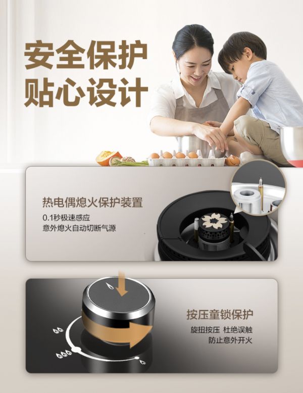 安全,是绝不可妥协的底线。樱花燃气灶S507GA特别旋扭按压的童锁保护,杜绝误触造成的意外开火;另外还搭载热电偶熄火保护装置,能够在0.1秒内敏锐感知意外熄火,并自动切断气源,全面杜绝燃气泄漏风险,守护家的每一刻安宁。