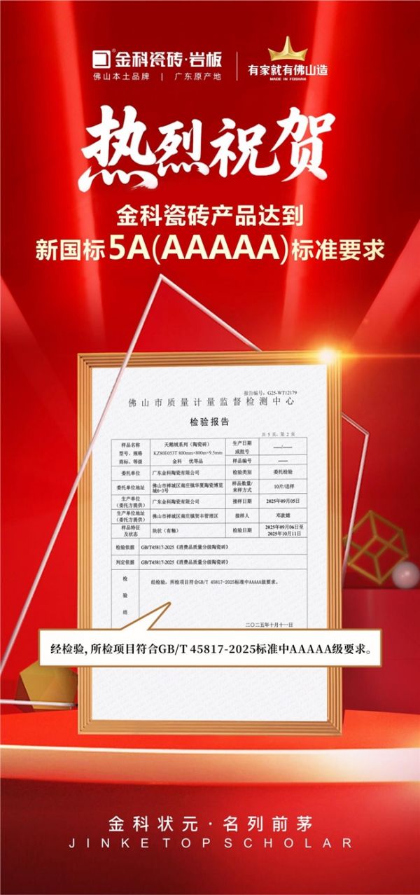 此次产品达到新国标5A标准要求,标志着金科瓷砖在高质量发展道路上迈出新的一步。未来,金科将继续以“品质为根、品牌为魂”,严格执行更高质量标准,专注5A标准瓷砖制造,为消费者提供优质产品,为行业高质量发展贡献力量。