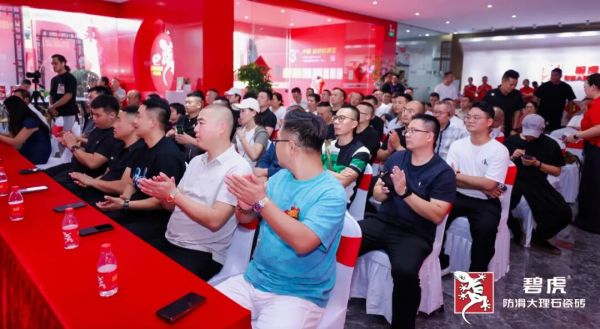走进7000平方的碧虎总部大楼,火热景象处处可见:有前来看砖选样的,有做防滑易洁测试的,有了解加盟政策的,有老客户前来续约打款的......现场人流络绎不绝,洽谈区座无虚席。