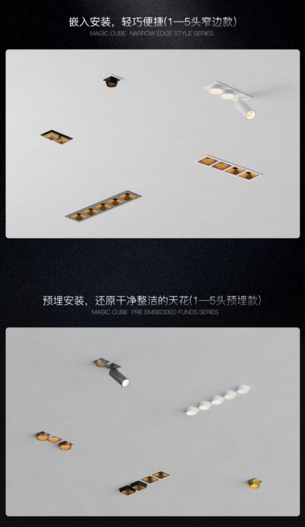 特别值得关注的是,MINI魔方系列创新性地采用了卡扣式卡扣结构与精密电子弹簧针的组合设计。这一设计让灯具安装过程变得简单顺滑、高效省力,更实现了光源切换的自由随心,为后期光源模组的更换与灯具维护提供了极大便利。同时,该设计还赋予了设计师卓越的自由度与空间创造力,真正做到了实用与便捷兼具。