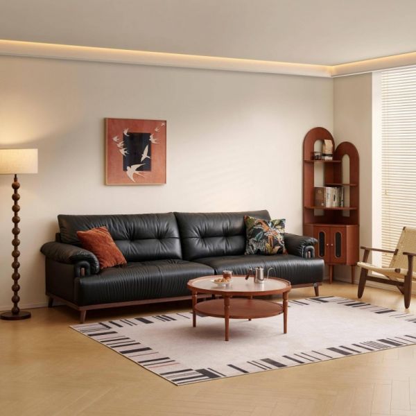 面料甄选进口头层牛皮,纹理细腻,手感柔润顺滑。流畅弧形线条结合层叠座靠设计,搭配实木天然肌理,共同营造浓郁复古氛围。外翻扶手灵感源自古建筑拱门,内填生态鹅毛与微孔高弹棉,兼顾美学与舒适体验。实木底架坚固稳定,为整体结构提供坚实支撑。