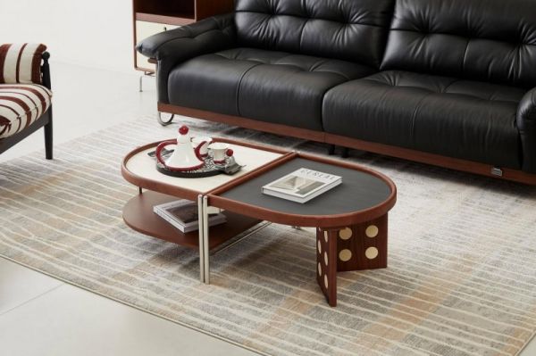 组合茶几设计,可自由组合或单独使用,时尚百搭。设计灵感源自斯卡帕对圆形元素的解构表达,规律排列的镂空圆孔赋予茶几灵动韵律。茶几分别采用深浅双色微晶玻璃台面,形成鲜明明暗对比,视觉层次丰富。红橡木实木边框配合加高设计,有效防止物品滚落。