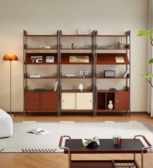 中古质感组合置物架,金属框架构筑出高定级别的时尚气场。分区收纳设计巧妙融合开放与封闭空间,轻松容纳书籍、杂志与各类摆件。亮面不锈钢与温润木纹相映成趣,兼具视觉张力与自然温度。不锈钢拉手造型精巧,兼顾美观与实用功能。