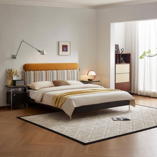 靠包采用撞色条纹设计,延续孟菲斯风格,彰显艺术感与个性。中古提花条纹面料,立体交织饱满,手感柔软细腻。不锈钢床头装饰柱与底脚,增添现代轻奢感,稳固耐用。松木铺板床体结构,稳固耐用,承载每夜安稳好眠。