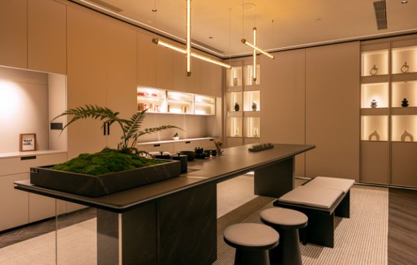 餐厅,轻轻一按,电视隐于无形;茶室,智能茶台,在从“品茶”到“品空间”的沉浸, 感受隔空传茶的“黑科技”;衣帽间,升降智能岛台,优雅收纳新境界,实现从“收纳”到“造型管家”的进化。