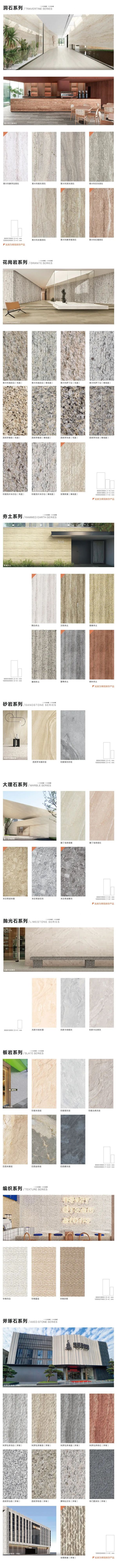 生态软瓷涵盖“洞石、大理石、花岗岩、板岩、编织、砂岩、夯土、抛光石、斧琢石”9大系列,精准复刻天然材质的肌理与质感,触感真实、纹理逼真,让墙面在光影变化中更具层次感和立体感。