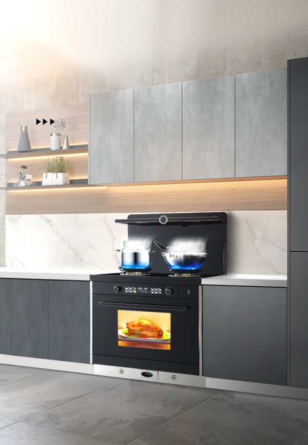 老房厨房普遍存在面积狭小、动线混乱、设备老旧等问题。传统分体式厨电(烟机、灶具、消毒柜、蒸烤箱等)独立安装,不仅占用空间,还容易造成操作不便;而老式排烟系统吸力不足,导致油烟弥漫、清洁负担加重。如何在“螺蛳壳里做道场”,成为改造的关键。