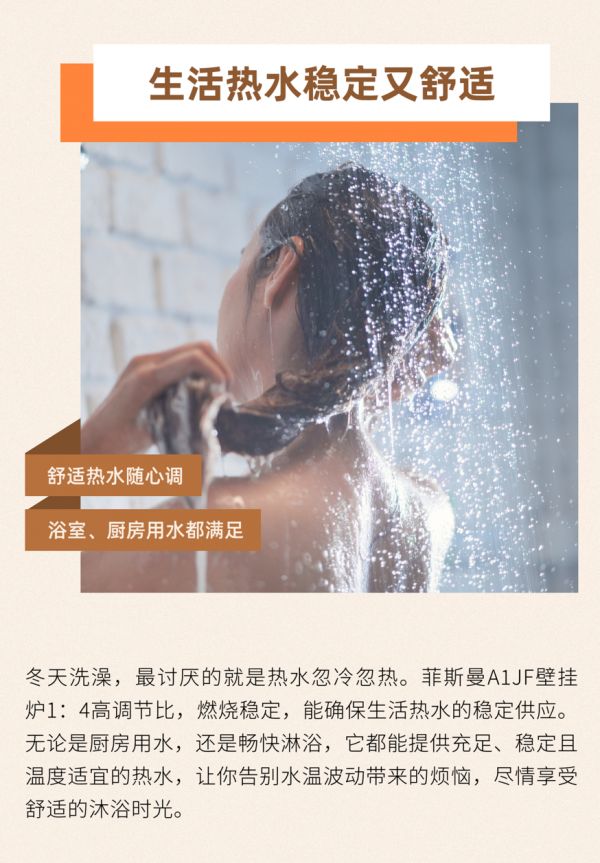 冬天洗澡,最讨厌的就是热水忽冷忽热。菲斯曼A1JF壁挂炉1:4高调节比,燃烧稳定,能确保生活热水的稳定供应。无论是厨房用水,还是畅快淋浴,它都能提供充足、稳定且温度适宜的热水,让你告别水温波动带来的烦恼,尽情享受舒适的沐浴时光。