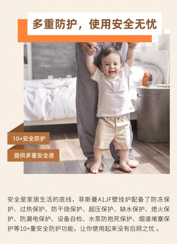 安全是家居生活的底线,菲斯曼A1JF壁挂炉配备了防冻保护、过热保护、防干烧保护、超压保护、缺水保护、熄火保护、防漏电保护、设备自检、水泵防抱死保护、烟道堵塞保护等10+重安全防护功能,让你使用起来没有后顾之忧。