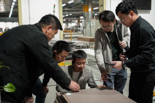 随后,嘉宾一行移步科凡智能化生产基地。从自动化裁切生产线到精密加工设备,再到全流程品控体系,科凡展现了从原料入库到成品交付的标准化能力。北新团队重点关注板材加工精度与数字化流程,对科凡实现“精准裁切、高效交付”的实践给予高度评价。