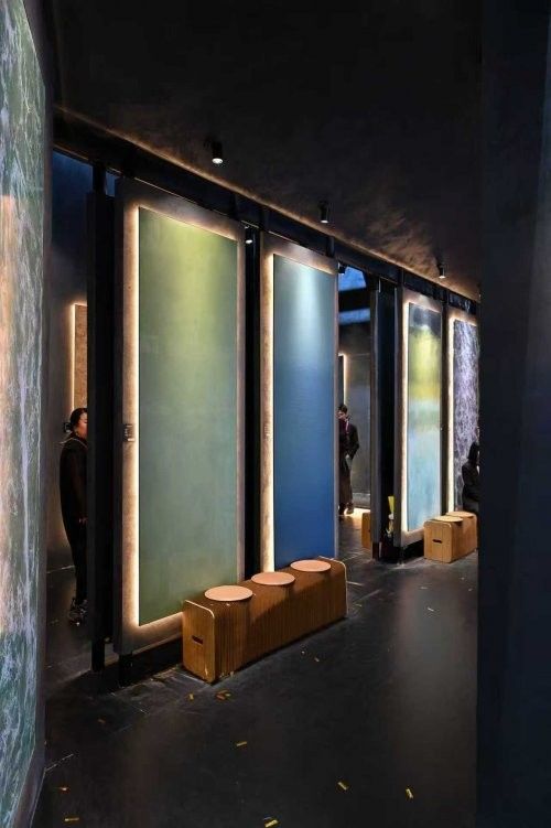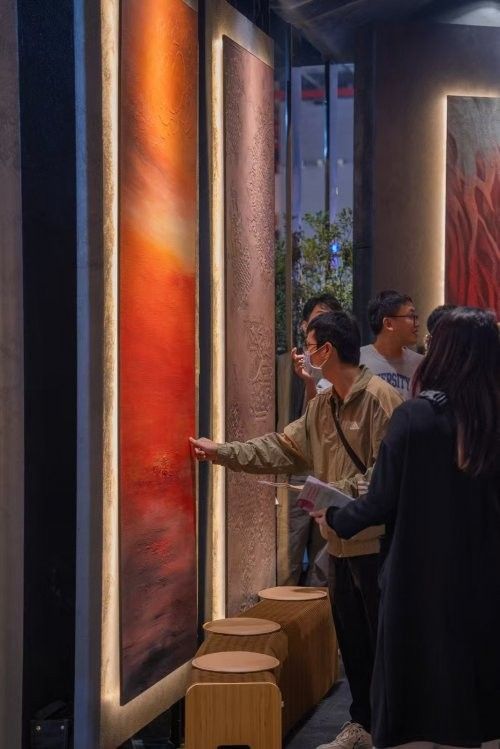 季节流转,通过看、触、点睛的中国文化主题呈现。石膏系列结合专业批刮手法,工艺师傅的手绘再创作,模仿出天然玉石的通透和纹理,生动的表达富有生命力的【春山醒-立春】。利用艺术涂料各自系列的自身特质相互融合达到各种自然形态效果,炙热尚存的【秋之汐-秋分】。本次展出的每一幅作品都恰到好处的采用艺术涂料的特质、专业工艺手法来表达每个节气独特的气韵。在作品创作初期就有很多客户、行业人士慕名前来参观,为12月的正式亮相做了首批流量分享。