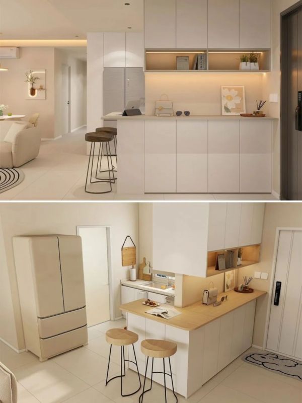 玄关留空的操作台面与吧台转角融为一体,将单一的入户区域转变为功能复合的迷你生活角。