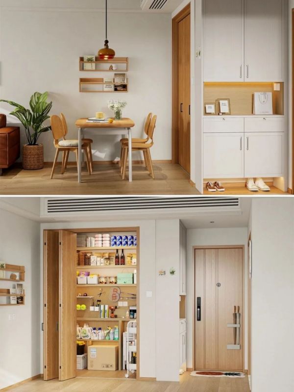 在玄关区域打造一个步入式的独立储物空间。家中的清洁工具、行李箱、运动器材等大件物品都能有序归置。
