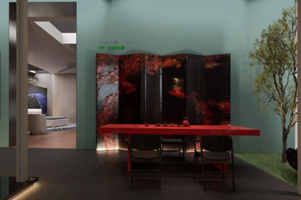 “序|归心之路”以山石肌理墙面与光影叙事墙开篇,瞬间隔绝展会喧嚣;“绿野之庭”的草垛座椅区成为设计师交流聚集地;“漆阁”中传统大漆与螺钿家具的搭配,配合苔藓间浮动的月影光球,唤起无数观者对家族记忆的共鸣。而“土之间”“水厅”的空间格局,更将自然肌理与情感表达融入细节,让“亲爱”的多元内涵转化为可触摸的人居体验。