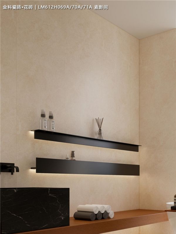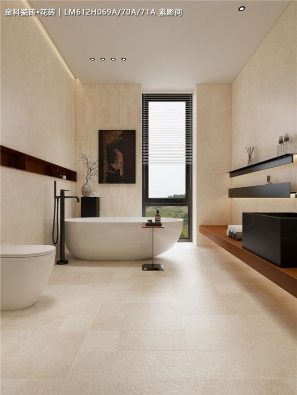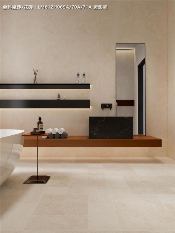 观感:干粒喷涂工艺使砖面色彩过渡柔和自然,高度还原天然莱姆石历经岁月形成的独特肌理和温润色调。