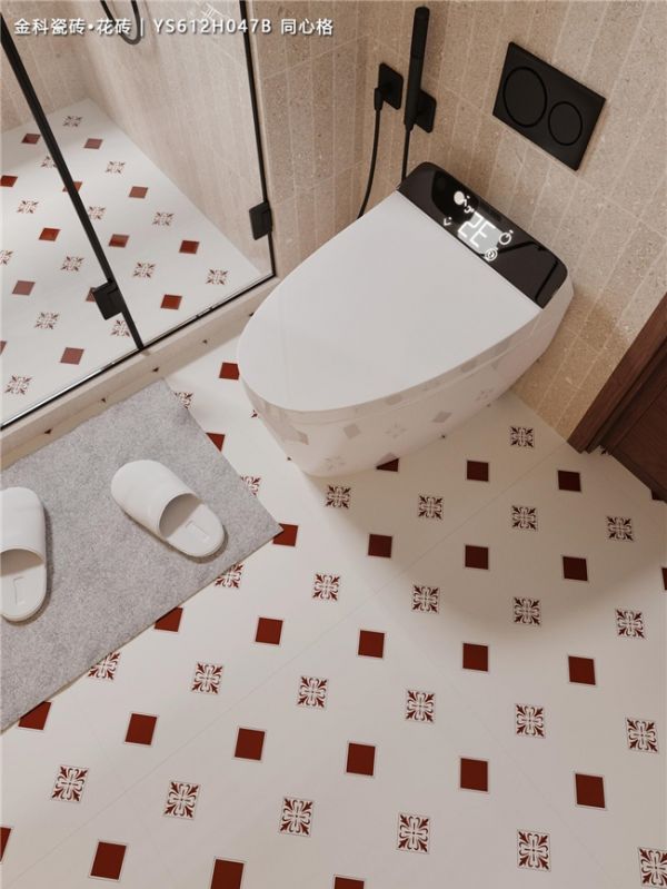 金色菱形纹理在白底上蔓延,与智能马桶的科技感、黑色五金件的利落线条,意外地碰撞出一种奇妙的和谐——既有复古风的醇厚韵味,又不失现代的简洁高级。