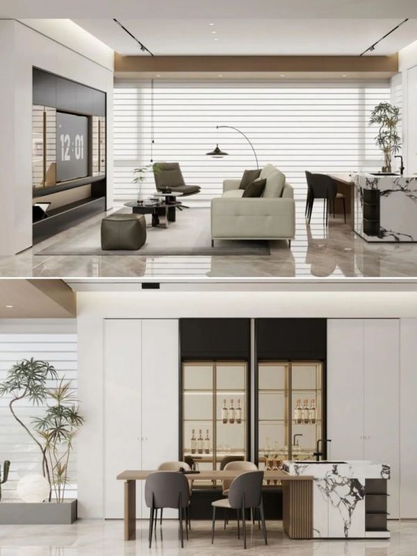 柜体的一面可以作为客厅的颜值展示面,另一面则成为餐厅或书房强大的收纳支撑。这种方式让空间显得整洁有序,美观与功能并存。