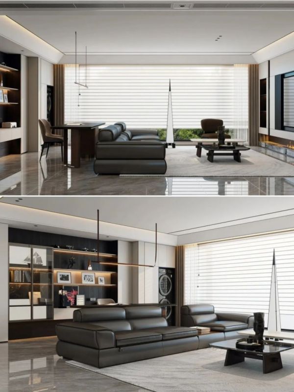 地台下方嵌入柔和的灯带,能瞬间提升空间的层次与氛围感。此设计也适用于通过拆改形成的“伪横厅”结构。