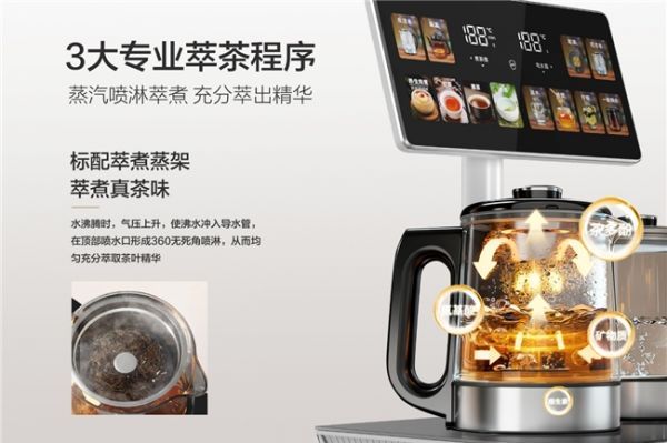 针对爱茶人士的需求,新品搭载了 3 大专业萃茶程序,采用蒸汽喷淋萃取技术 —— 水沸腾时通过气压驱动沸水 360° 无死角喷淋茶叶,专茶专时的设定能充分激发茶黄素和茶氨酸,让茶叶快速舒展、茶汤澄澈透亮、茶香层次分明、口感回甘悠长。这意味着用户可以轻松泡出专业级的好茶,无论是喜欢浓郁醇厚的红茶,还是清香淡雅的绿茶,都能精准匹配,让每一杯茶都达到最佳口感。