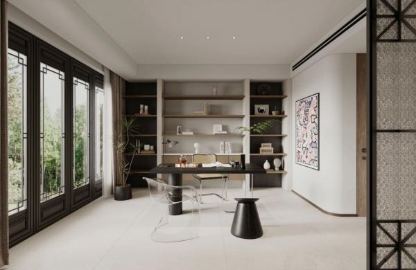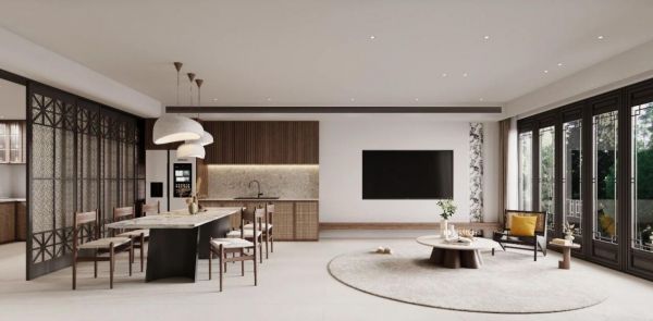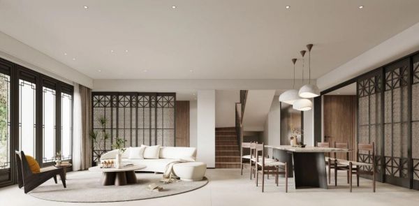 外立面保留中式传统形制,室内以轻中式手法延续结构基因,门窗采用深黑框+中式格栅元素,兼顾外立面风格统一性与材质轻量化质感。