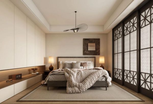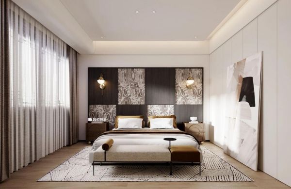卧室以“去繁就简”为原则,通刷暖白乳胶漆,搭配木饰面床头背景,选用线条简约木质床架,搭配针织床品与复古金属壁灯,以轻装饰平衡中式沉静与中古温柔。