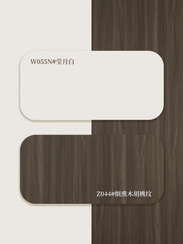 莹月白纯净柔和,搭配烟熏胡桃木的深邃质感。这套组合理性而温润,非常适合营造宁静且有深度的现代简约空间。