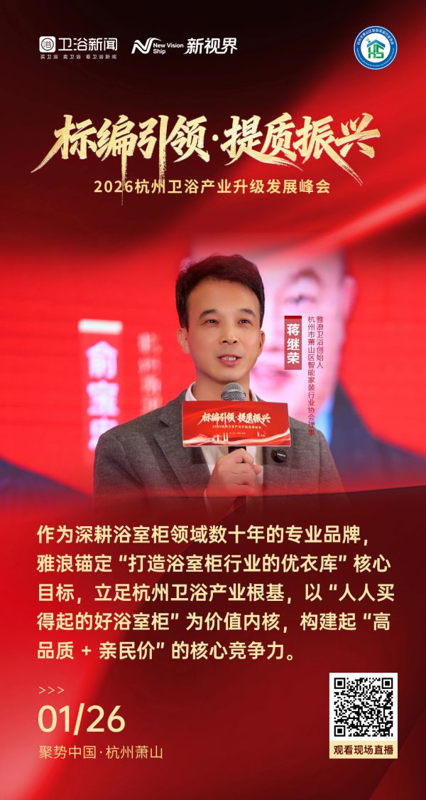 1 月 26 日,2026 杭州卫浴产业升级发展峰会隆重启幕,本次峰会以 “标编引领,提质振兴” 为核心主题,汇聚行业权威、领军企业及创新力量,围绕产区未来、品牌进化与价值重构展开深度对话。作为杭州卫浴产区的标杆企业,雅浪卫浴创始人蒋继荣受邀出席活动,并深度参与核心环节《标兵引领 —— 产区先锋论坛》,结合品牌 “打造浴室柜行业优衣库” 的发展理念与实践经验,为杭州卫浴产业高质量发展贡献普惠化与标准化并行的发展思路,助力 “杭州卫浴” 集体品牌崛起与 “浙江制造” 金名片擦亮。