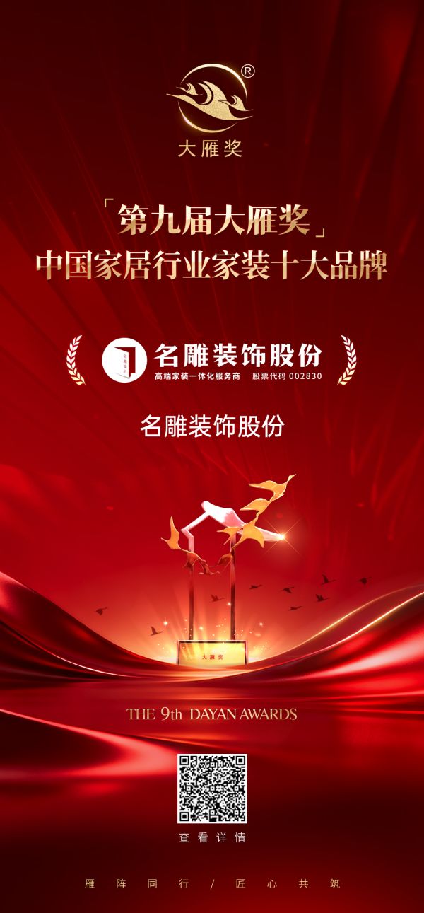 1月30日,「第九届大雁奖」获奖名单于云端发布会正式揭晓。名雕装饰股份凭借其在家装领域的卓越产品力、领先的品牌影响力与持续的市场引领表现,荣获“第九届大雁奖·中国家居行业家装十大品牌”这一细分领域的权威殊荣。
